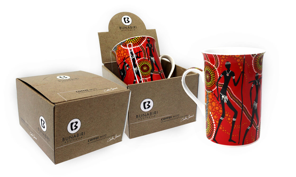 Aboriginal people have a profound spiritual connection to their land and the circles in the reproduction of the traditional painting “Hunters and Gatherers Land” represent the life forces of the land and the colours of the circles symbolise the changing colours of the Red Centre in Central Australia. Aboriginals lived in small family groups and were a hunter-gatherer people who adapted well to their land. In the reproduction the warriors are carrying the kangaroo back to their campsite and family group. Aboriginals always respected their land and its many food sources and never appropriated more than they needed. Everyone had a place of value in the family group and everything was shared. So all the family shared in on the kangaroo, but the warrior who caught the kangaroo and his family got the better portion.